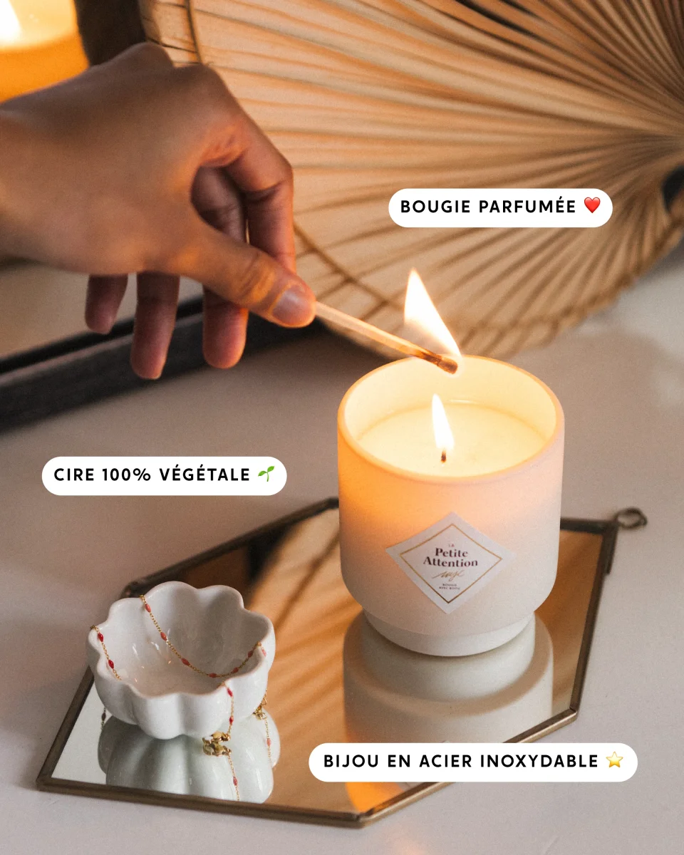 Bougie bijou La Petite Attention My Jolie candle. Bijou en acier inoxydable avec perles rouges. Cire à base végétale, mèche en fibres naturelles de coton, parfum français. Cadeau parfait.