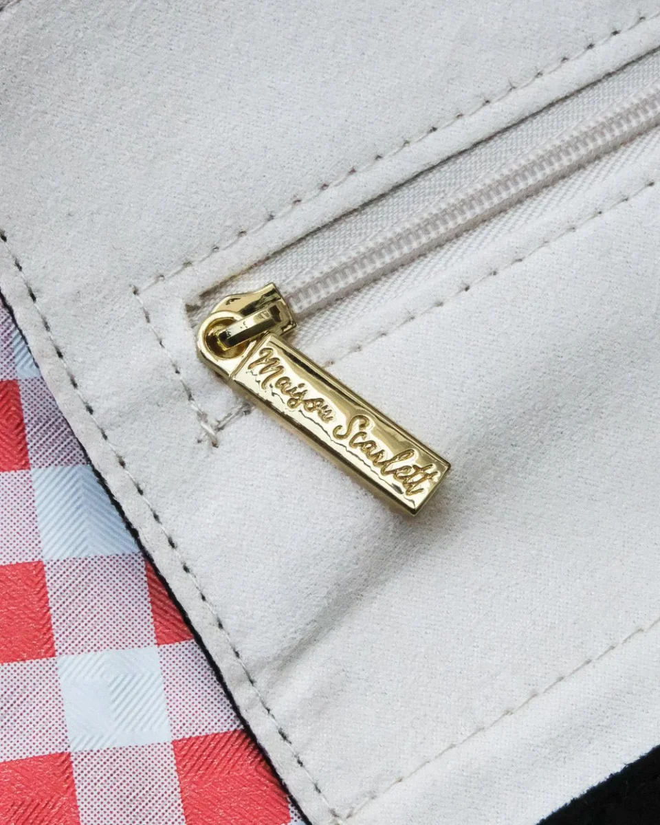 - Fermetures éclairs en acier doré, gravées Maison Scarlett pour plus d’élégance