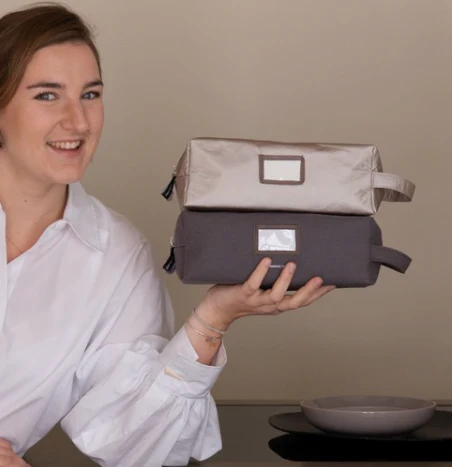 C’est parfait comme trousse de toilette, ou peut-être pour vos pinceaux. L’étui a une sangle sur le côté et une petite pochette pour écrire votre nom ou le but de l’étui. Il y a aussi une petite trousse assortie.